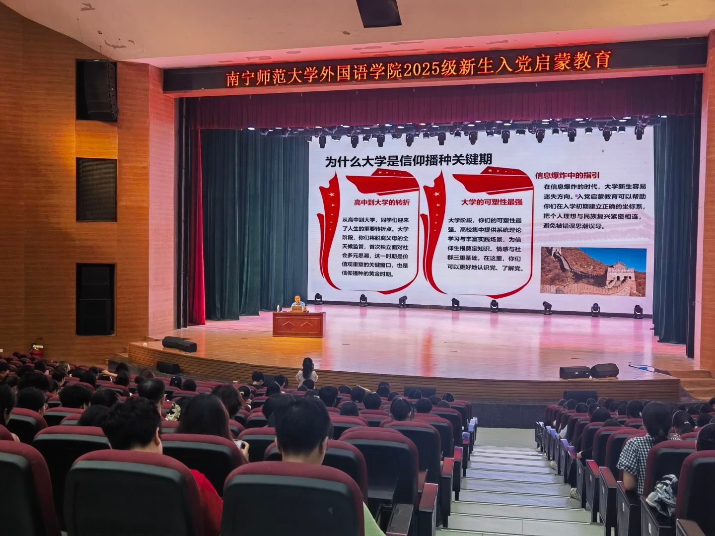 9月18日下午,外国语学院党委在武鸣校区音舞楼1号报告厅开展了2025级本科新生入党启蒙教育。本次入党启蒙教育由外国语学院吴世全老师主讲,外国语学院2025级全体本科新生参与了此次入党启蒙教育活动。