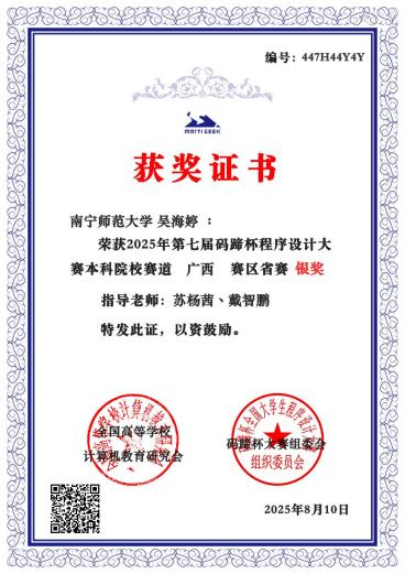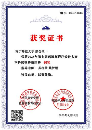 近日,由全国高等学校计算机教育研究会主办、高校计算机教学与产业实践联盟承办的2025年“码蹄杯”全国程序设计大赛圆满落幕。在苏杨茜、戴智鹏等老师的组织指导下,人工智能学院30名学生经过省赛和国赛的激烈角逐,最终荣获全国铜奖1项,省赛金奖2项、银奖4项和铜奖2项的佳绩。