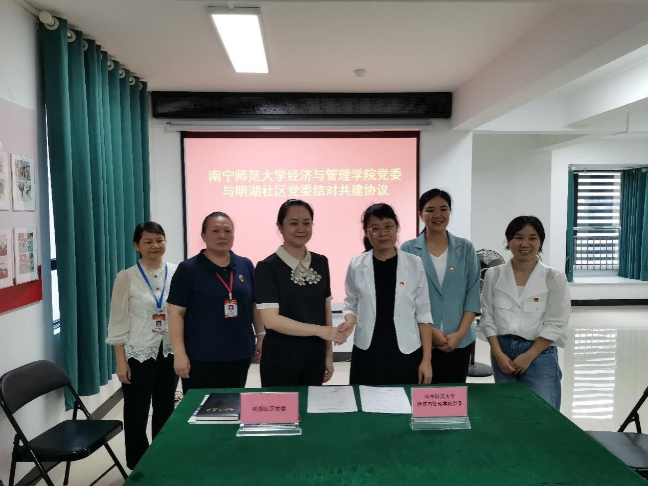 为进一步深化党建引领,推动高校与社区资源共享、优势互补,2025年9月23日下午,Beat365正版唯一官网必一经济与管理学院党委与明湖社区党委在明湖社区党群服务中心举行结对共建签约仪式。学院党委副书记、院长何玲玲教授,公共管理系主任陈柳源博士,公共管理系教师韦立立副教授,明湖社区党委书记、居委会主任杨绍贤、明湖社区党委副书记胡晓丹、明湖社区副主任陆春香等双方领导及相关学生教师代表参加了本次签约仪式。