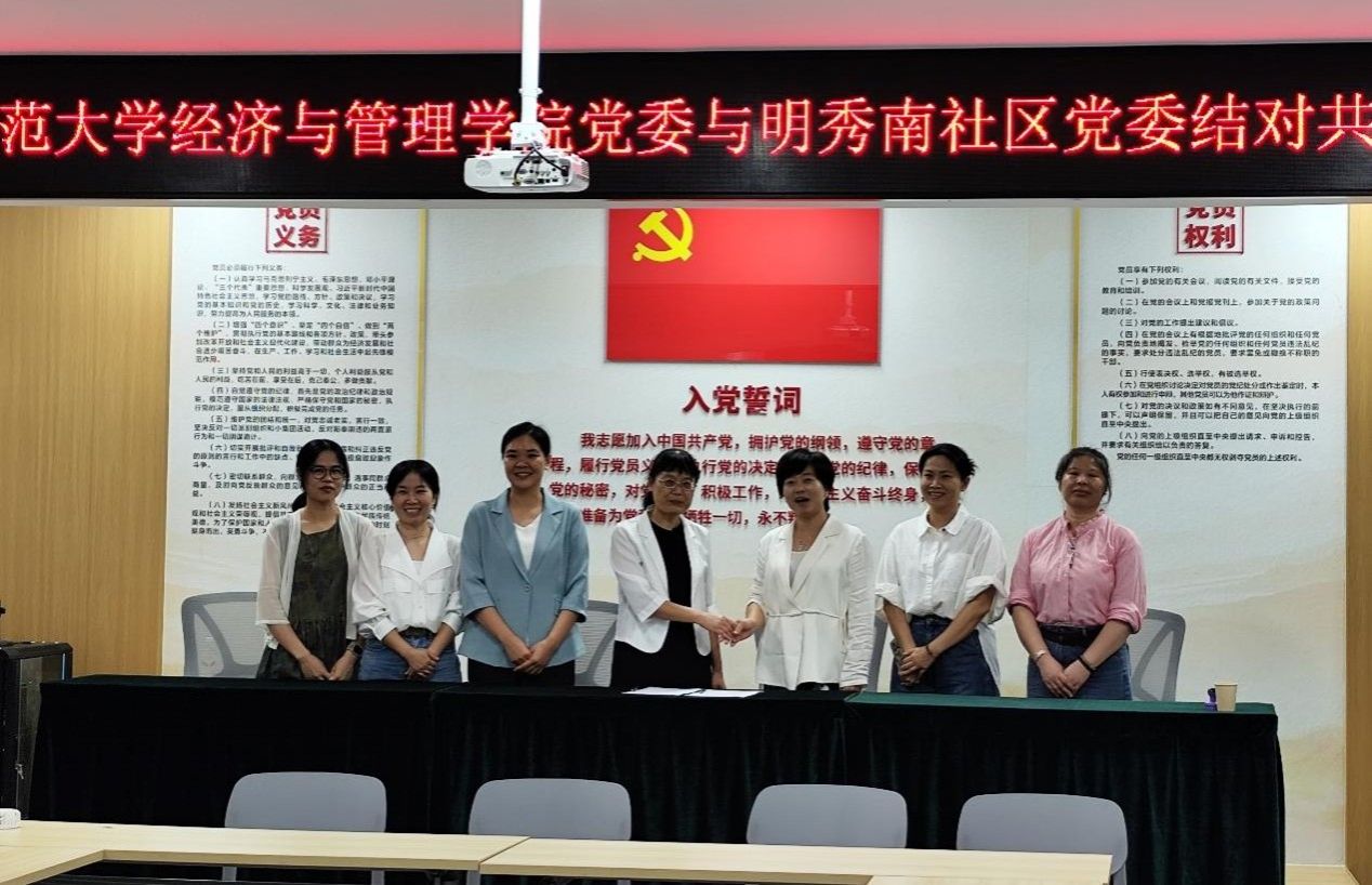 为深入贯彻党建引领基层治理与高校服务社会发展协同推进的工作要求,促进高校与社区资源共享、优势互补,2025年9月23日下午,Beat365正版唯一官网必一经济与管理学院党委与明秀南社区党委结对共建签约仪式在明秀南社区党群服务中心举行。经济与管理学院党委副书记、院长何玲玲,北湖街道党工委副书记、纪工委书记林洁,明秀南社区党委书记、居委会主任杨芳洁出席仪式,双方党务工作者、教师代表及学生骨干共50余人参加活动。