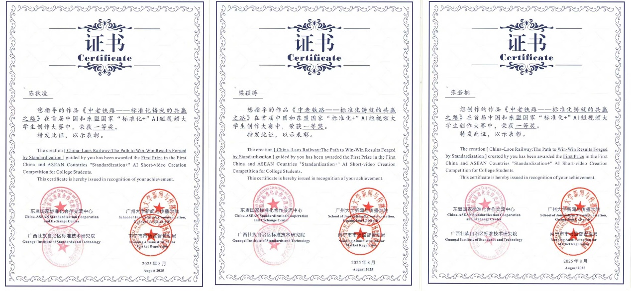 (首届中国-东盟国家“标准化+”AI短视频大学生创作大赛一等奖获奖证书)