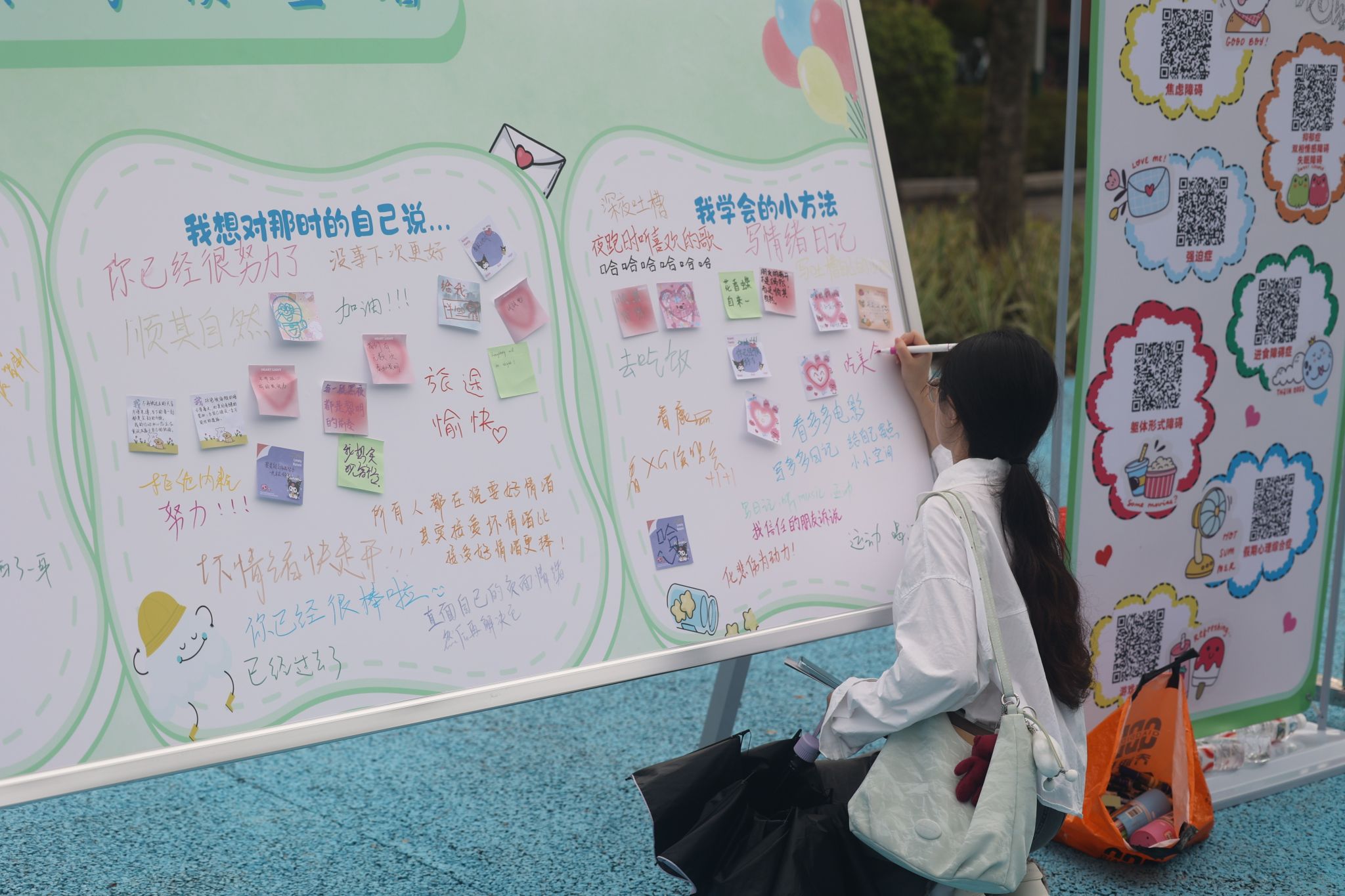 本次活动紧扣“提升心理素质、消除心理污名”核心目标,创新设置三大特色互动板块,打造沉浸式心理关怀场景。在“污名化消除角”,同学们通过扫码学习专业心理知识,或在“心声便签墙”书写感悟、参与“标签改写行动”,在互动中打破认知偏见、表达真实自我;义诊咨询环节,学校特邀南宁市第五人民医院精神科医师坐诊,为同学们提供“十分钟精准答疑”服务,及时疏导心理困惑、解答情绪难题;志愿者还现场发放心理健康宣传手册与定制心灵书签,让心理知识以更贴近生活的方式走进学生。