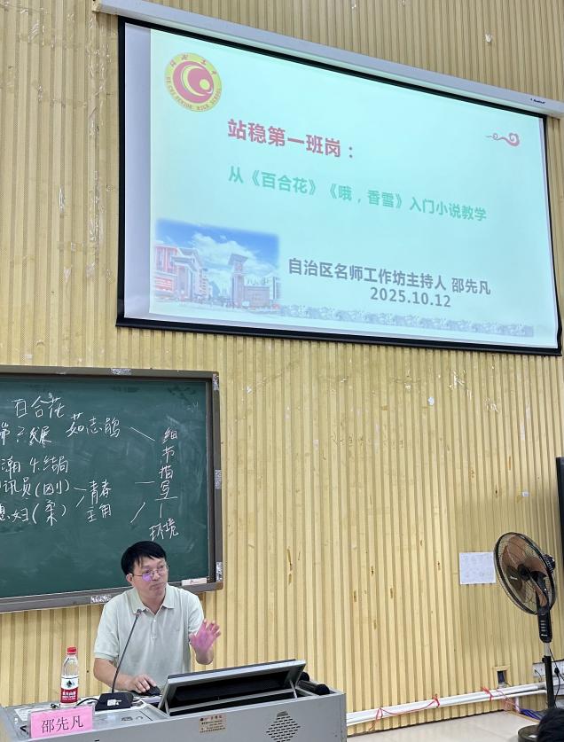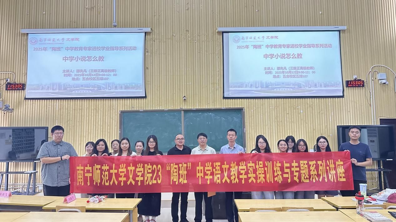 为充分发挥校外导师在“双导师制”中的实践指导效能,进一步夯实陶行知实验班学生中学语文教学实操能力,切实提升人才培养质量,2025年10月12日(星期六)上午,文学院2023级陶行知实验班于五综107教室举办第二场“中学语文教学实操指导与专题讲座”。本次讲座邀请河池高级中学教育专家邵先凡老师莅临现场,开展教学实践指导工作。文学院副院长(主持行政工作)刘振平、语文课程与教学论教研室教师陈亚飞出席,文学院2023级陶行知实验班全体学生、学科语文研究生及其他学生代表参加讲座。