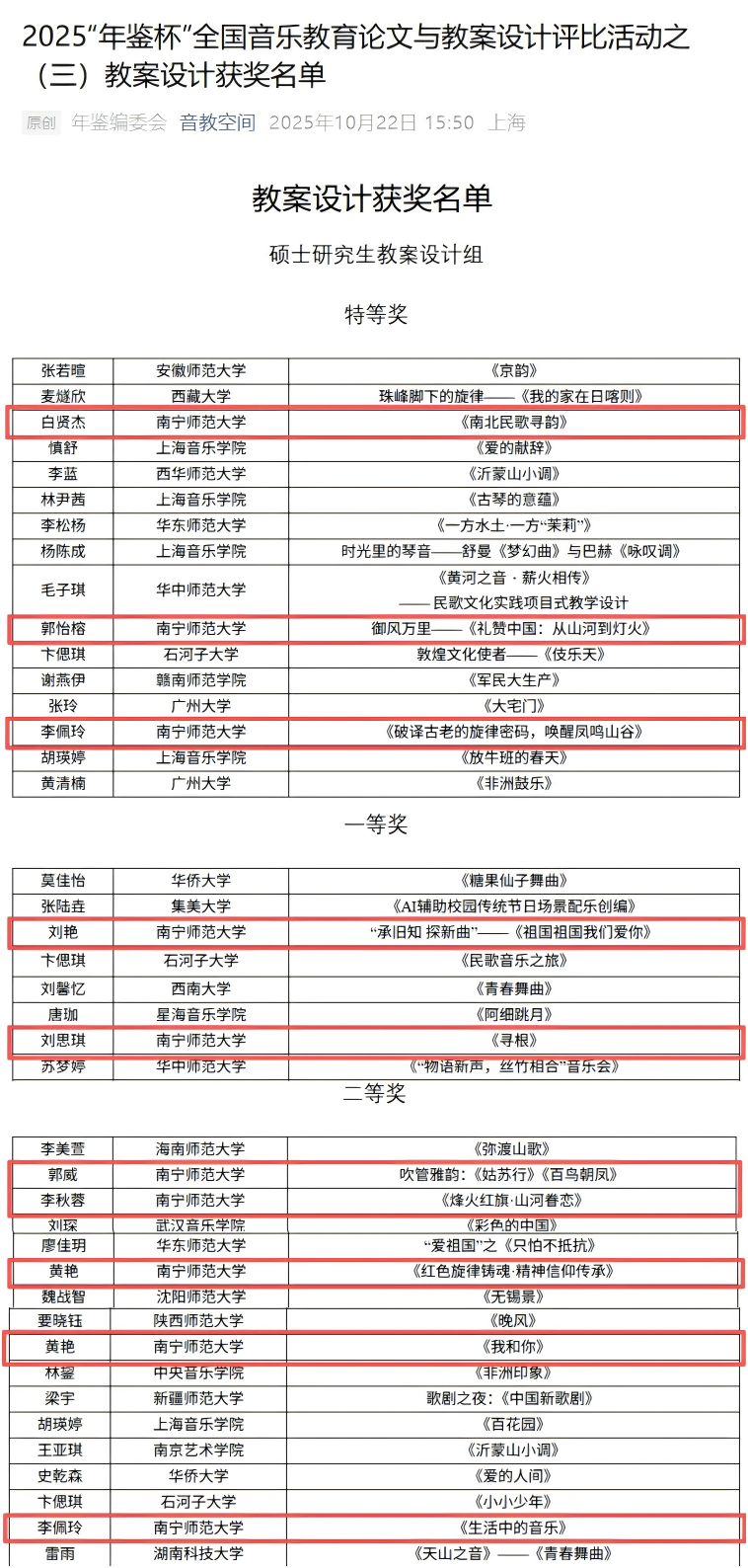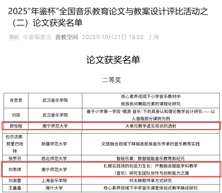 近日,由《中国音乐教育年鉴》编委会主办,上海音乐学院承办的2025年“年鉴杯”全国音乐教育论文与教案设计评比活动近日圆满落幕。Beat365音乐与舞蹈学院研究生在比赛中表现优异,共有8名同学的12项作品获奖。