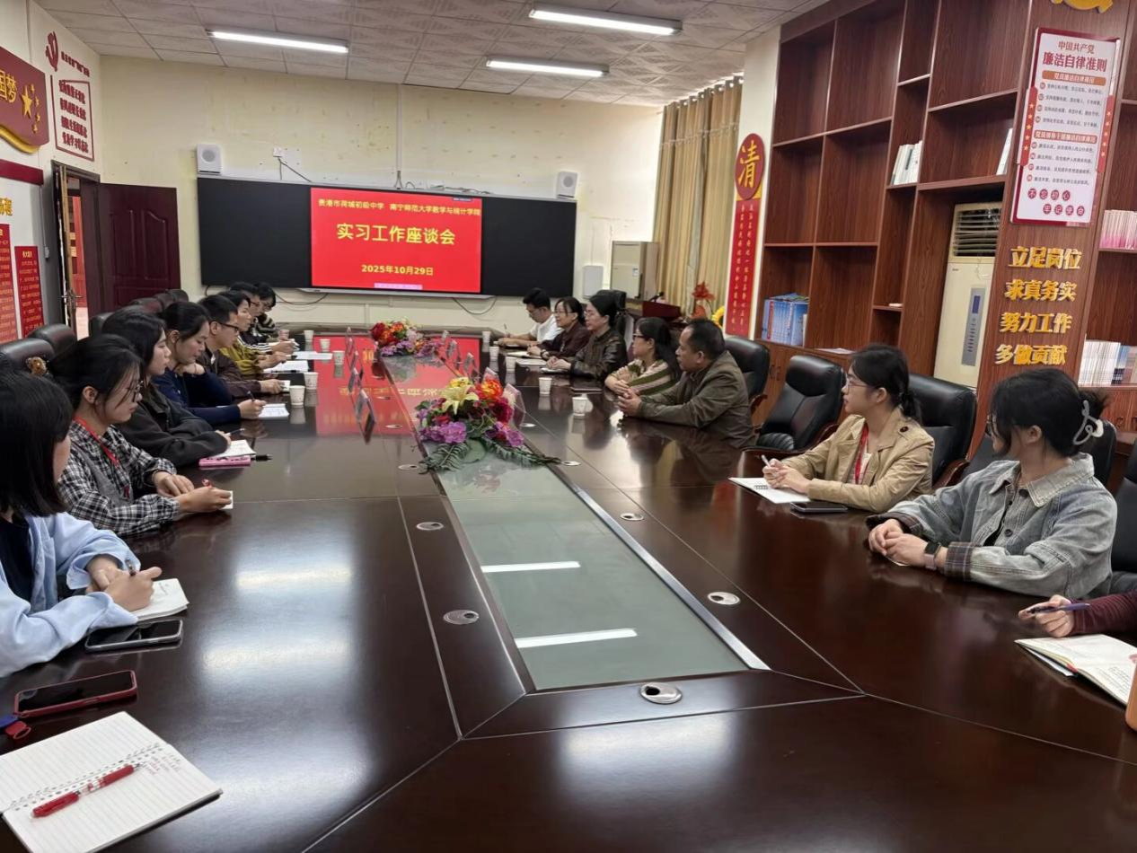 检查组一行通过“听、看、谈、评”多维度了解实习情况。在贵港一中,检查组参与“携手育桃李·实践启新程”实习中期交流活动,重点与学校指导老师、指导班主任深入交流,同时与实习生一对一沟通,从教学目标达成、重难点突破等方面给予针对性指导;在贵港市荷城中学,该校副校长杨永成在座谈中对我院实习生的表现给予高度评价,他表示:“贵校实习生专业基础扎实,工作态度认真负责,在教学实践中展现出的学习热情和成长速度令人欣喜,期待未来能与学院开展更深度的合作,共同为教育事业培养优质师资。”在港南二中,检查组通过开展座谈会的形式,深入了解实习生在岗表现,听取学校对学院实习安排的意见建议,同时关切询问实习生生活适应程度、工作困惑等情况,鼓励大家珍惜实践机会,主动向学校教师学习,在实践中锤炼教学技能。