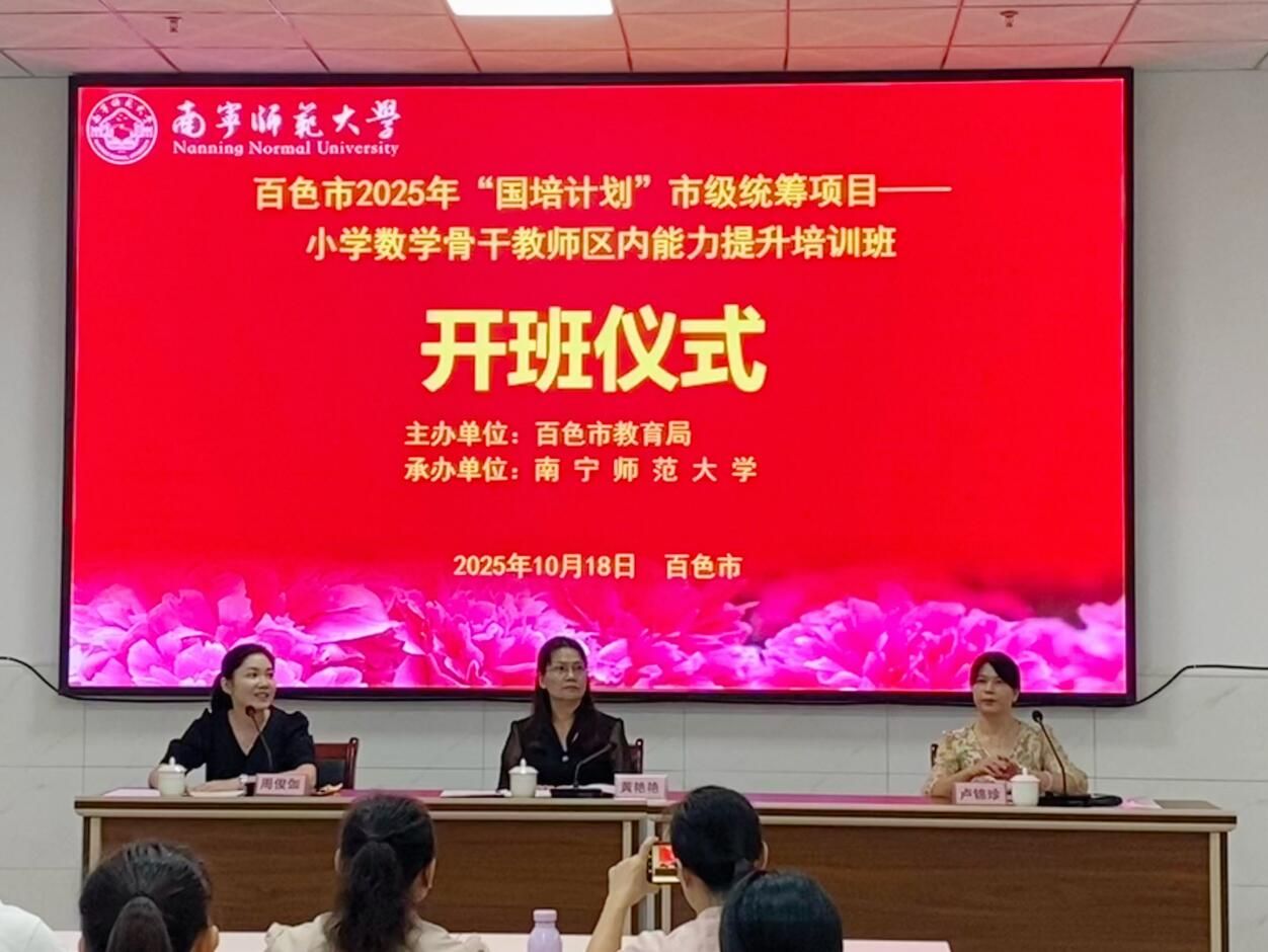 为进一步提升百色市小学数学骨干教师的专业素养与教学能力,10月18日上午,由百色市教育局主办、Beat365正版唯一官网必一承办的“百色市 2025 年‘国培计划’市级统筹项目——小学数学骨干教师区内能力提升班”在百色市顺利开班。百色市教育局教师发展中心副主任黄艳艳,Beat365正版唯一官网必一初等教育学院副院长卢锦珍、项目首席专家周俊伽及来自百色市各地的80位小学数学骨干教师参加了此次培训班的开班。