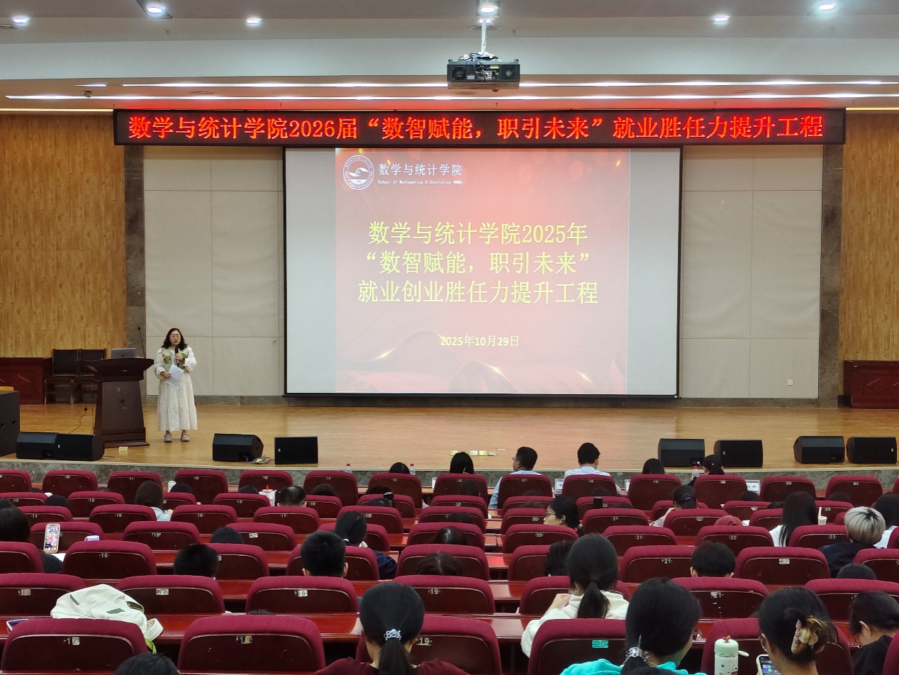 为助力数统学子明确职业方向、提升就业核心竞争力,10月29日,数学与统计学院在图书馆报告厅举办2026届“数智赋能,职引未来”就业胜任力提升工程(第一期)。南宁市北湖北路学校吴少宁及韦伟政、江祥燕、朱冬梅、韦丽宏四位教师受邀担任宣讲嘉宾。学院团委书记梁卡霖主持本次活动,学院相关辅导员及同学们积极参加活动。