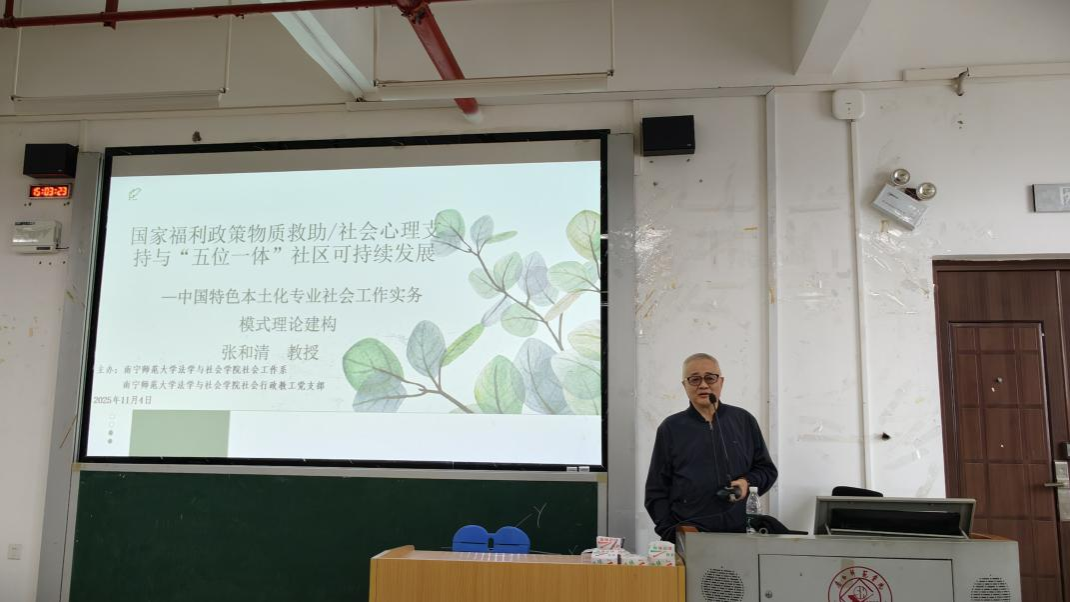 为深化学生对社会工作本土化理论与实践的理解,11月4日下午,法学与社会学院社会工作系特邀华南农业大学社会工作学科首席专家、中山大学社会学与社会工作系教授、博士生导师张和清教授开展专题讲座。张教授以“国家福利政策物质救助/社会心理支持与‘五位一体’社区可持续发展——中国特色本土化专业社会工作服务模式理论建构”为主题,在文综415教室为学院师生带来一场内容丰富、见解深刻的学术讲座。