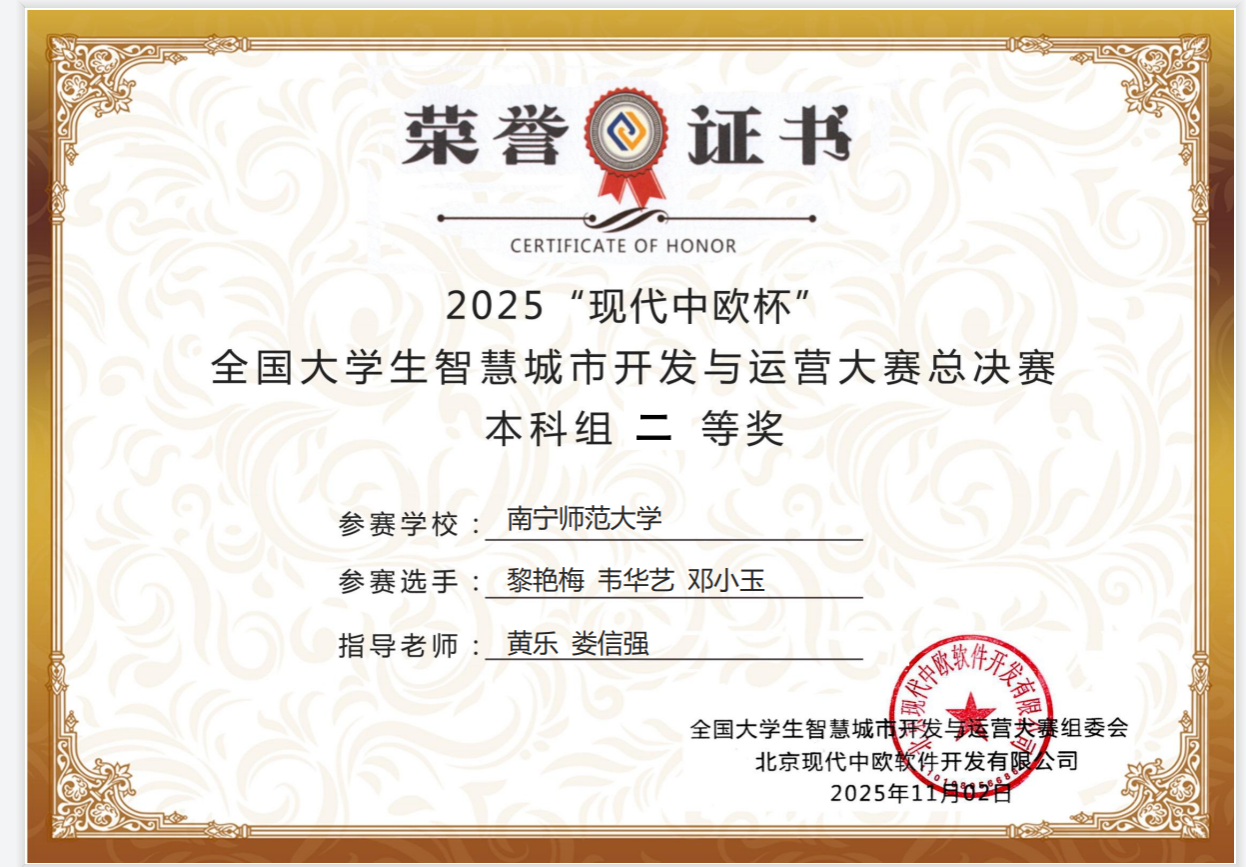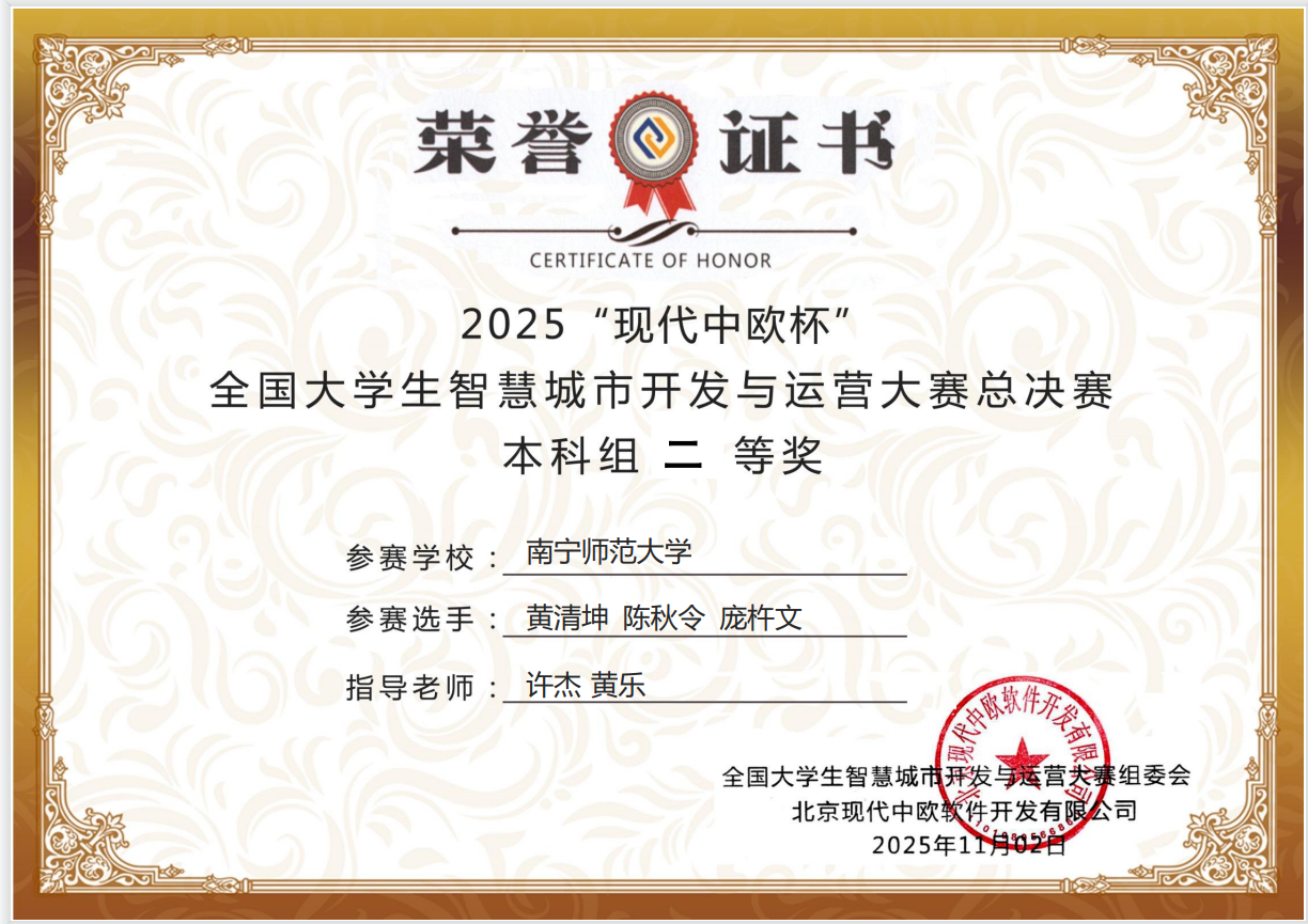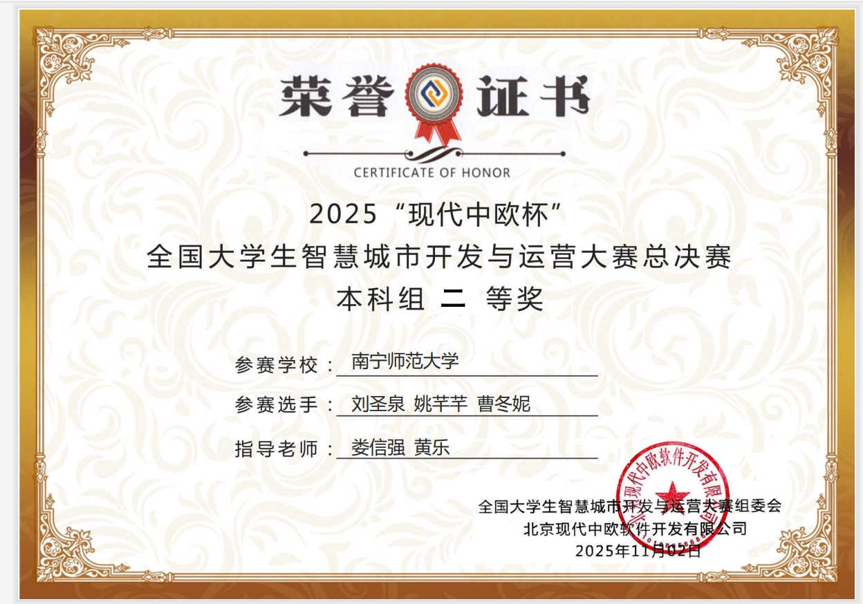 2025年11月1日,Beat365自然资源与测绘学院房地产开发与管理专业学生参加了2025“现代中欧杯”全国大学生智慧城市开发与运营大赛全国总决赛,由娄信强主任,黄乐老师,许杰老师指导的3支队伍在本次比赛中表现卓越,荣获全国二等奖3项。