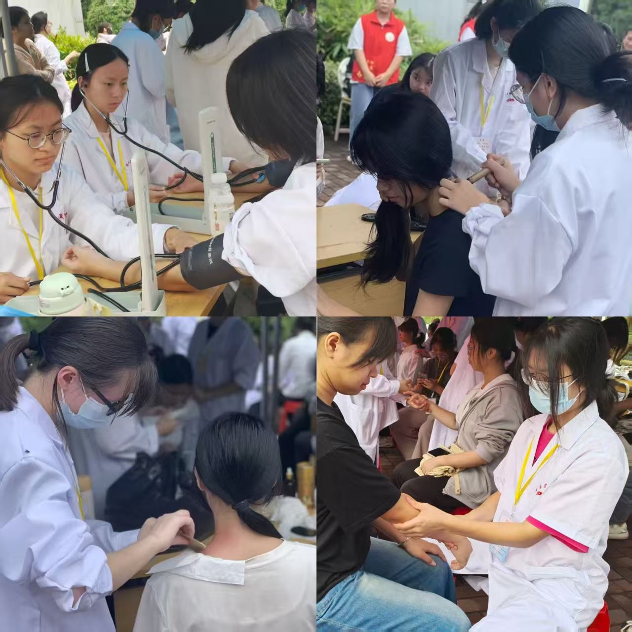 活动现场设置了三个服务区域,精准对接同学们的健康需求。在血压测量区前,志愿者耐心为排队同学逐一测量血压,并依据测量结果提供饮食、作息等个性化健康建议,帮助同学们及时掌握自身基础健康状况;在艾灸与刮痧服务区内,志愿者严格遵循中医操作规范,针对师生常见的颈肩不适、疲劳乏力等问题,精准选取穴位开展调理,用传统中医疗法缓解身体不适;在手法按摩区里,志愿者运用专业按摩技巧,为长期伏案学习、备考的同学放松颈肩腰背部紧张肌肉,有效舒缓身体疲劳,贴心服务获同学们一致认可。