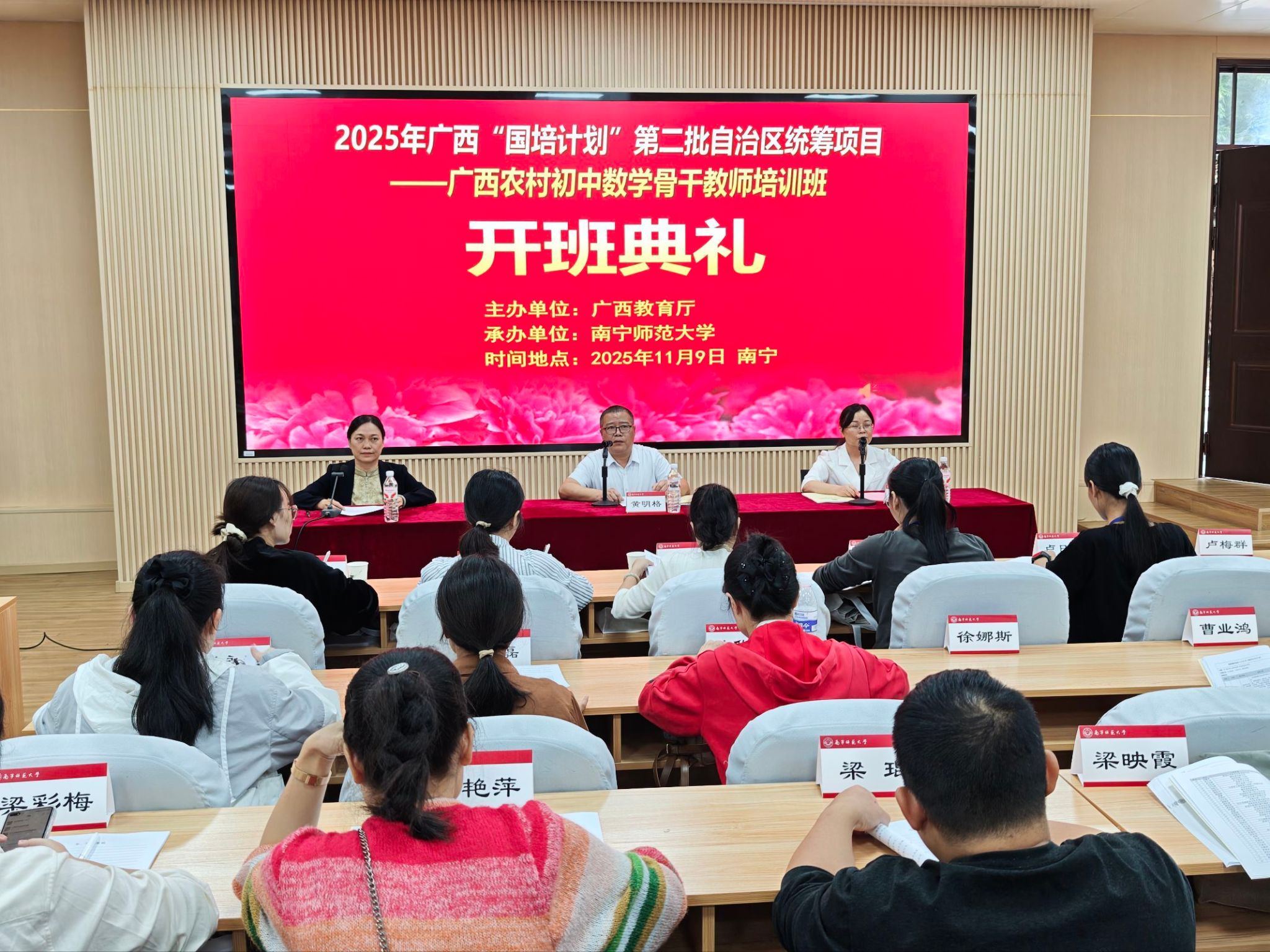 11月9日,2025年“国培计划”第二批自治区统筹项目——广西农村初中数学骨干教师培训班在Beat365正版唯一官网必一正式开班。本次培训由Beat365正版唯一官网必一数学与统计学院承办,来自广西各地的80名农村初中数学骨干教师齐聚一堂,开启为期12天的专业能力提升之旅。开班典礼上,Beat365正版唯一官网必一教师教育学院副院长黄明格、培训专家代表及班主任陈蔚凝老师出席,共同为培训拉开序幕。