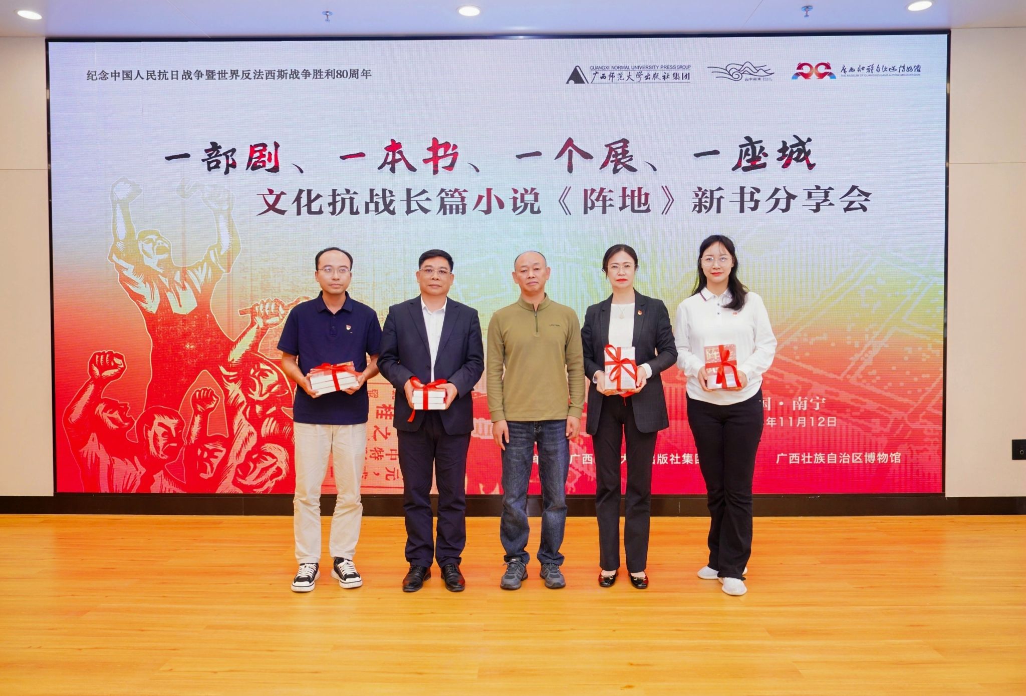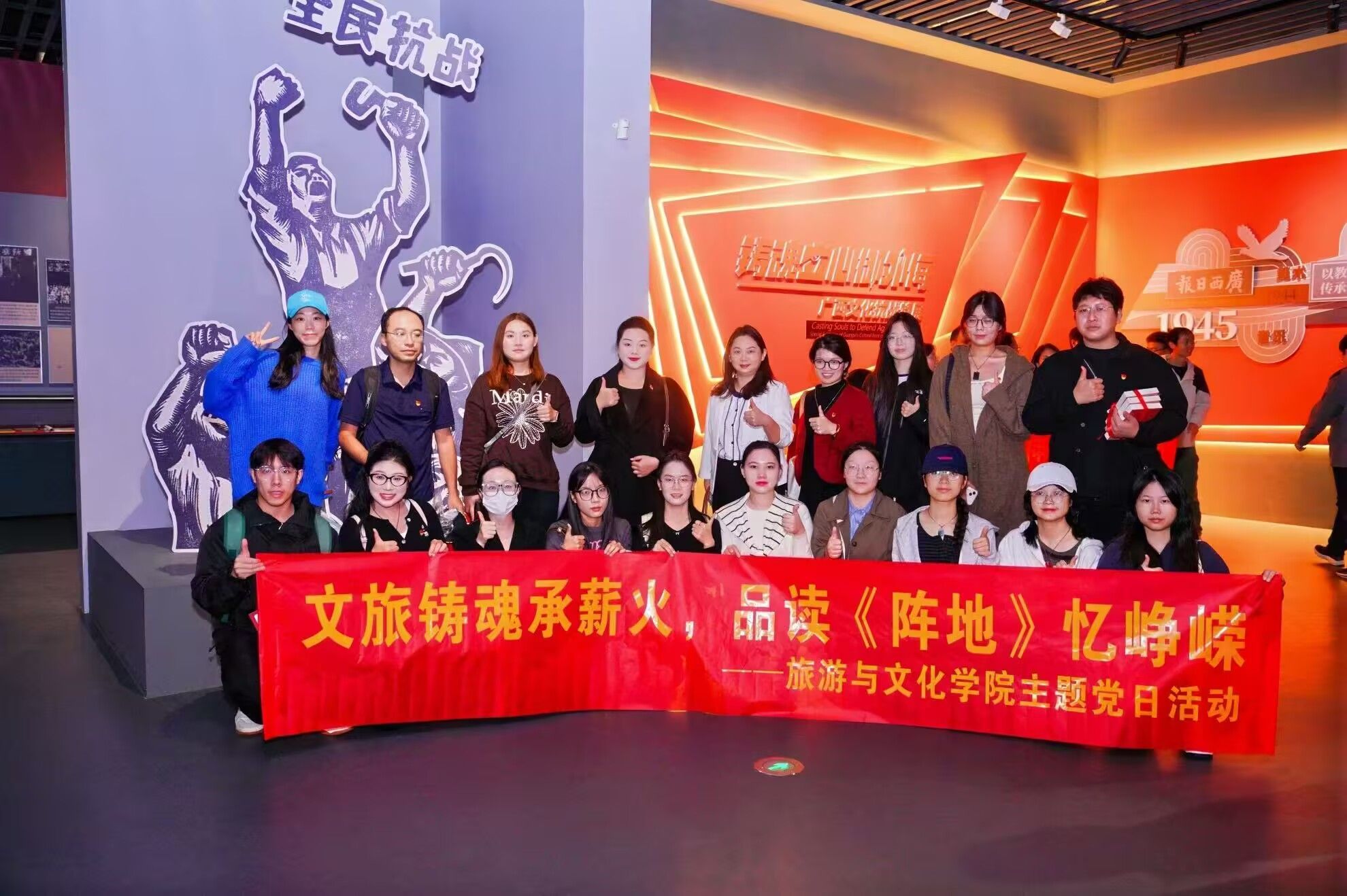 为纪念中国人民抗日战争暨世界反法西斯战争胜利80周年,深刻感悟文化抗战精神伟力,引导师生党员从峥嵘岁月中汲取奋进力量,11月12日上午,旅游与文化学院党委组织党员师生代表赴广西壮族自治区博物馆参加文化抗战长篇小说《阵地》新书分享会。本次“文旅铸魂承薪火,品读《阵地》忆峥嵘”主题党日活动,在沉浸式学习中重温文化抗战的热血岁月,让红色基因在文旅融合中代代相传。