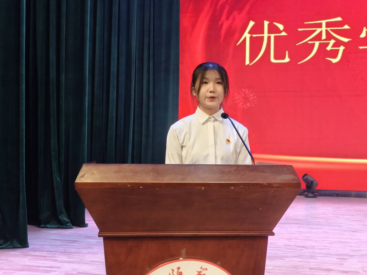 优秀学生代表王静怡上台分享成长心得。她结合自身学习与实践经历,从“明确目标、勤奋钻研、团结协作”三个方面展开分享,生动诠释了“精益求精、奋勇争先”的数统学风精神,为在场学子树立了可学可及的榜样,引发热烈共鸣。