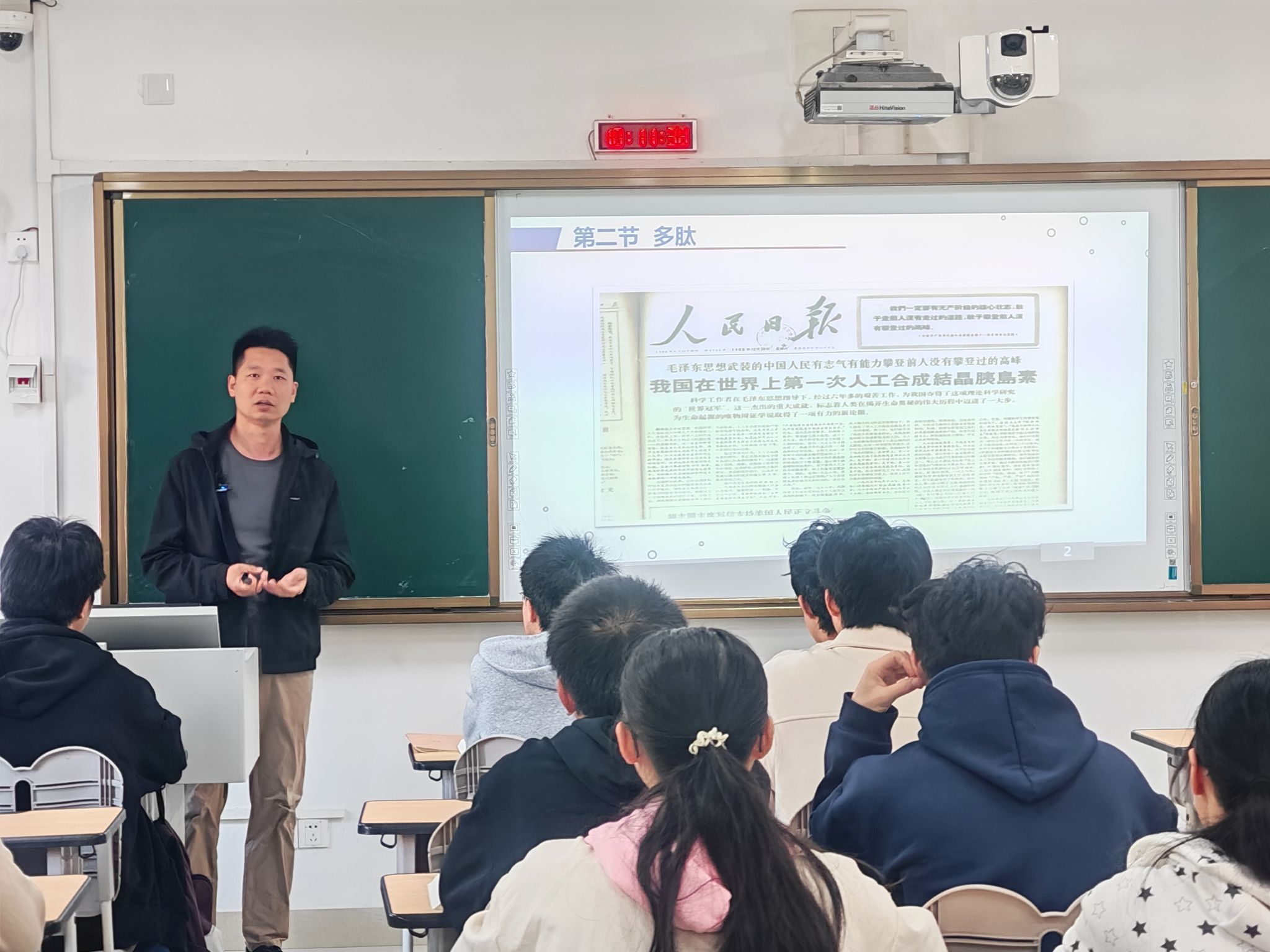 本次活动由谌文强博士为化学基地班学生讲授“廉洁教育”课程思政公开课《从多肽人工合成谈廉洁奉献》。公开课以1965年9月《人民日报》报道的“中国人工全合成牛胰岛素”里程碑成果为切入点,系统阐释了多肽的生物活性、结构特异性及合成需遵循的固相合成原理,结合当年科研团队在设备简陋、技术受限条件下,以分步验证、精准调控的科学态度攻克难关的历程,指出“严谨性”是基础学科研究的核心准则,强调科研“情怀”源于对学科前沿的执着追求和对国家和人民的热爱,“奉献”体现为攻克难题的坚守担当,引导基础学科拔尖学生以先驱为榜样,在基础研究中锤炼科学素养、厚植使命意识。