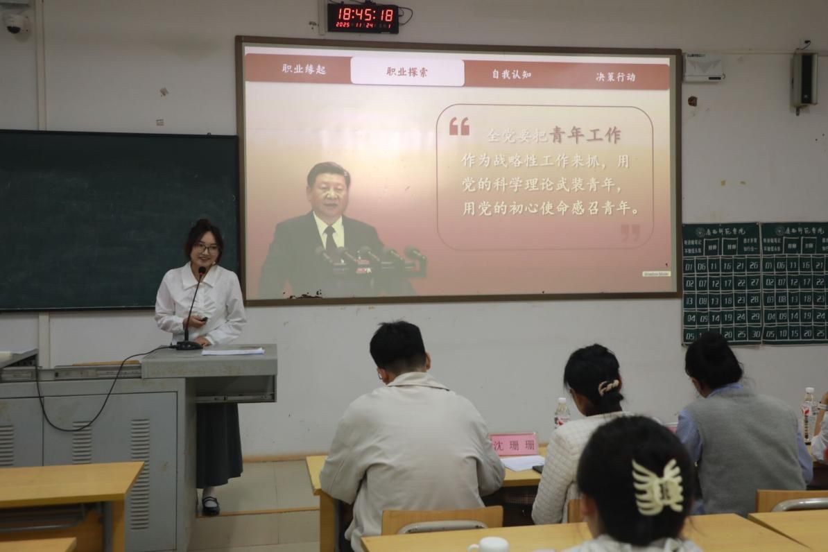 选手依序上台向各位讲解自己的职业生涯规划。成长赛道的选手们满含青年朝气,展现了对大学生活充实的规划与对未来的展望;就业赛道的选手聚焦现实中专业与岗位的适配情况,尽显专业水平与岗位认知。