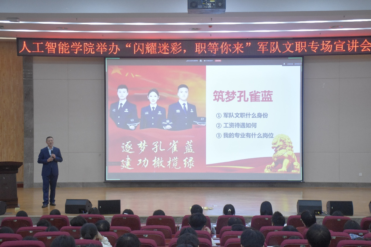 为深入了解军队文职政策,精准对接优质岗位,助力学生拓宽就业渠道,11月4日,人工智能学院在图书馆报告厅成功举办“闪耀迷彩,职等你来”军队文职专场宣讲会。学院邀请广西汇佰强教育投资有限公司(校友企业)教培部总监李忠,作题为“投身强军事业,成就职业梦想”的主题分享,广西汇佰强教育投资有限公司总经理姜川、校企合作部总监韦伟荣、学院辅导员林雪以及270余名学生参加宣讲会。