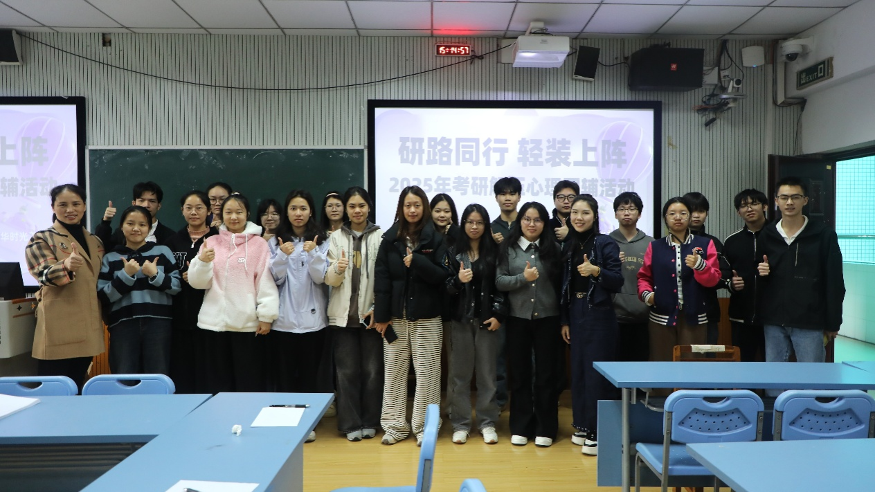 为助力大二、大三备考学子明确方向、减轻迷茫感,同时为大四冲刺考生缓解压力、调整状态,12月15日下午,初等教育学院与职业技术师范学院在明秀校区文星楼302教室,联合举办考研解压心理团辅活动。本次活动主要面向初等教育学院与职业技术师范学院大二、大三有意向考研的学生,以及正处于备考冲刺阶段的大四考研学生。