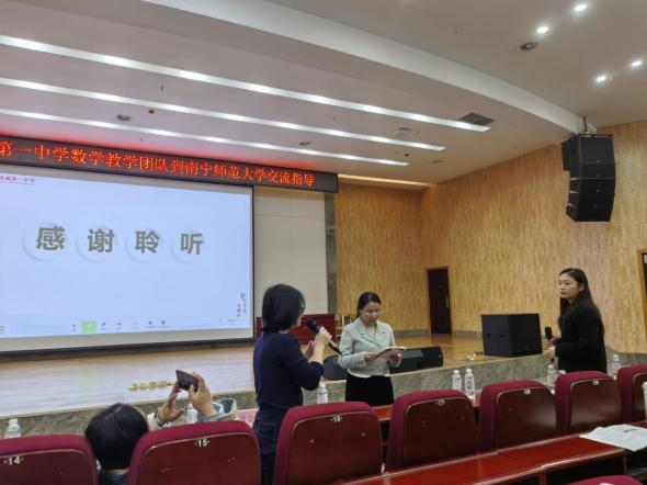 从2025年1月起,数学与统计学院与广西尊文智慧教育图书有限公司开展大数据赋能的中学精准教学合作研究,成立了广西大数据精准教学研究院。随后广西大数据精准教学研究院在北海市第十一中学、灵城县灵城第一中学、梧州市第五中学等多所学校建立了实验基地学校。本次活动由广西大数据精准教学研究院提供专业引领,广西尊文智慧教育图书有限公司提供“点知精准教学”平台、智慧教辅及技术的支持,钦州市灵山县灵城第一中学数学教学团队打造精品课例,通过精彩课例展示与专题讲座,生动演绎了大数据如何深度融入课堂教学,中学数学课堂教学如何基于AI及大数据技术支持的学情数据驱动备课、课堂数学活动组织、练习与测评各环节的精准实施,为发展学生数学核心素养、推动区域教育质量提升提供了可借鉴的实践范式。