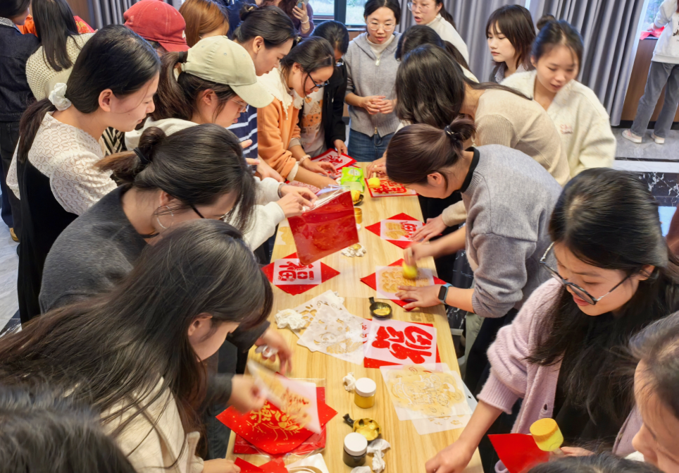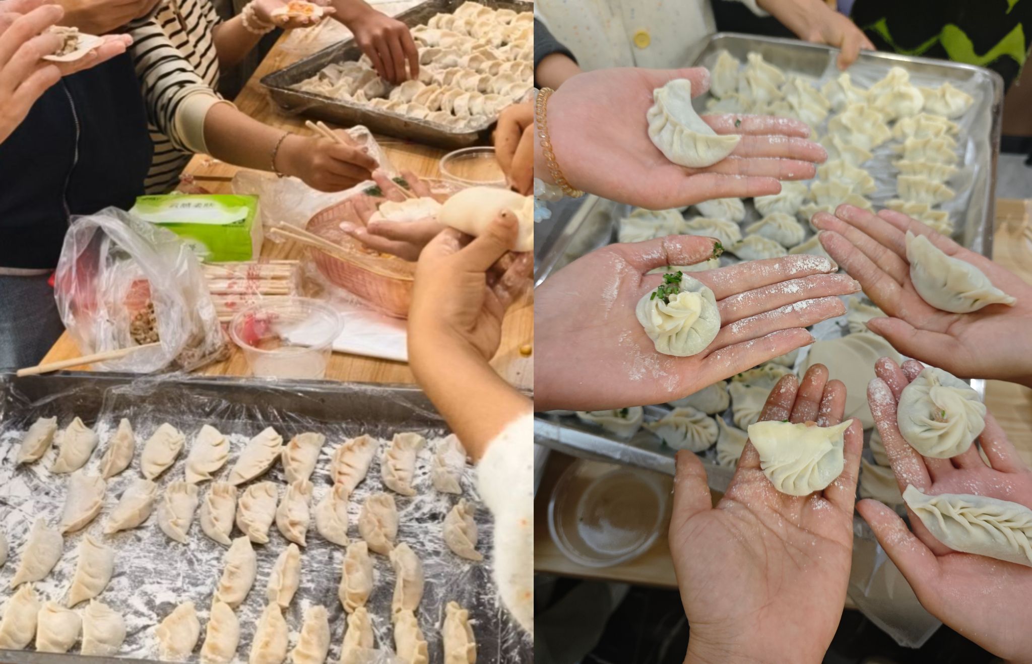 在物料长桌上,一边是墨香隐约的红纸与新春拓画,一边是待展的饺子皮、饱满的五色馅料,这看似分隔的两边,却因师生忙碌的身影与流转的笑意,悄然连接成了一幅完整的团圆图景。