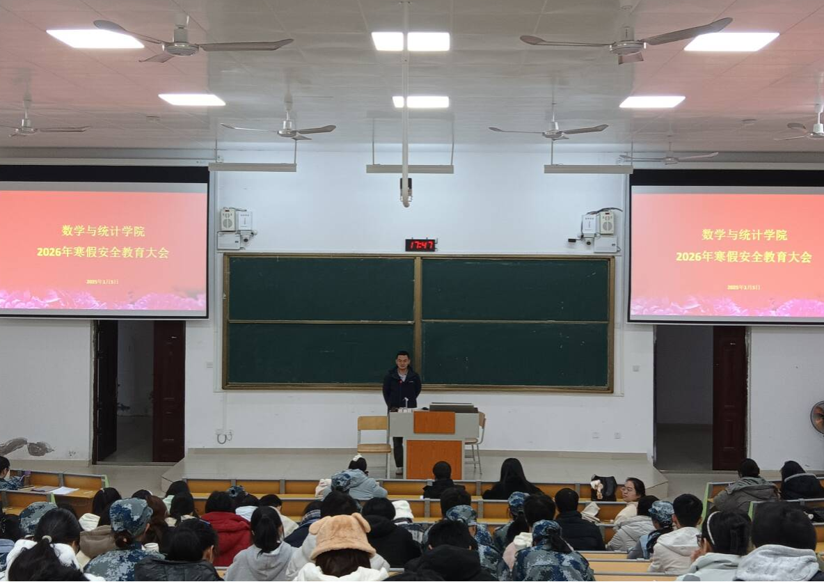 为进一步强化学生寒假安全防范意识,切实保障全院学生度过平安祥和的假期,1月5日,数学与统计学院在实验2-B108教室召开2026年寒假安全教育大会。学院党委副书记王卫彬,团委书记,辅导员及各班班长及生活委员参加会议。