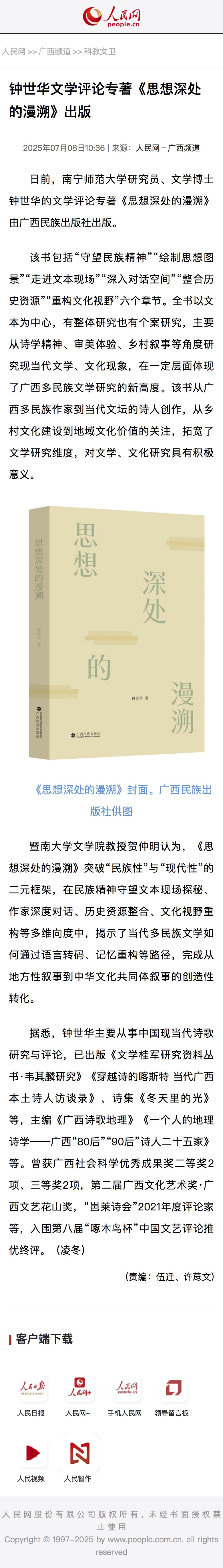 【人民网】钟世华文学评论专著《思想深处的漫溯》出版