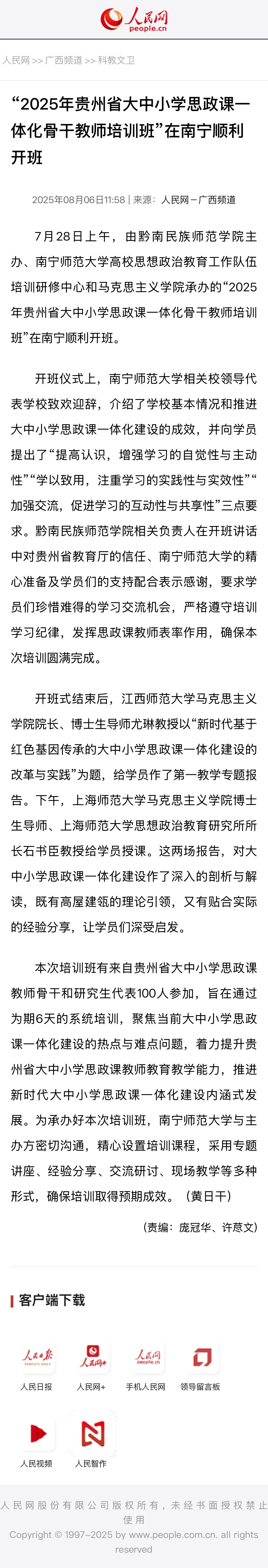 【人民网】“2025年贵州省大中小学思政课一体化骨干教师培训班”在南宁顺利开班