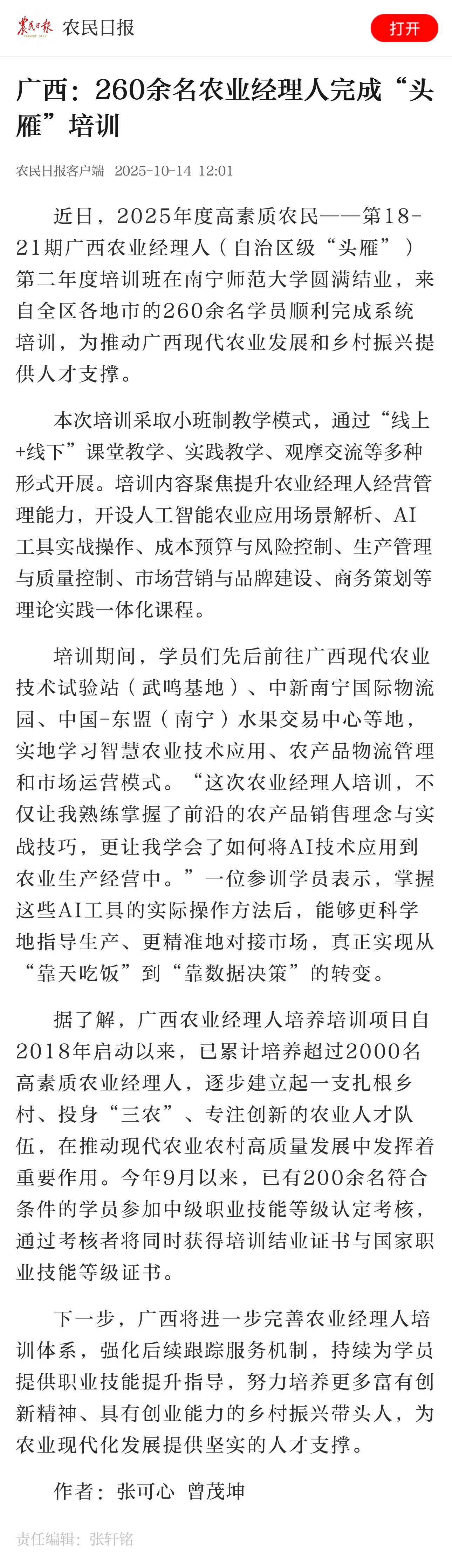 【农民日报】广西:260余名农业经理人完成“头雁”培训