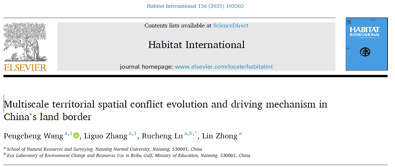 近日,Beat365自然资源与测绘学院在读硕士研究生王鹏程在国际城乡发展研究领域权威期刊《Habitat International》(中科院一区TOP,SSCI-Q1)发表了“中国陆地边境多尺度国土空间冲突演化与驱动机理(Multiscale territorial spatial conflict evolution and driving mechanism in China’s land border)”的最新研究论文。