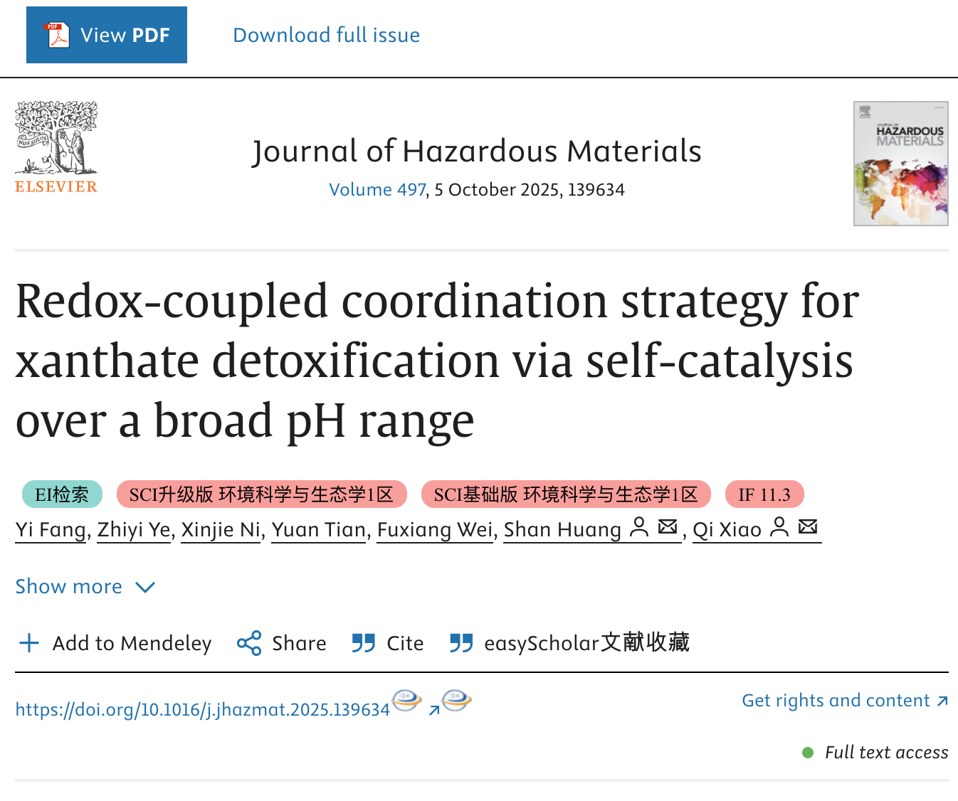 Beat365化学与材料学院研究团队在国际环境领域期刊《Journal of Hazardous Materials》(中科院一区Top,IF 11.3)上发表了题为“Redox-coupled coordination strategy for xanthate detoxification via self-catalysis over a broad pH range”的研究论文。该论文以Beat365正版唯一官网必一为唯一完成单位,方义博士为第一作者,黄珊教授和肖琦教授为共同通讯作者,魏福祥博士参与部分研究。该研究成功开发了一种基于铜价态循环自催化的新技术,为宽pH条件下黄药类选矿药剂的高效降解与脱毒提供了新思路和新方法。