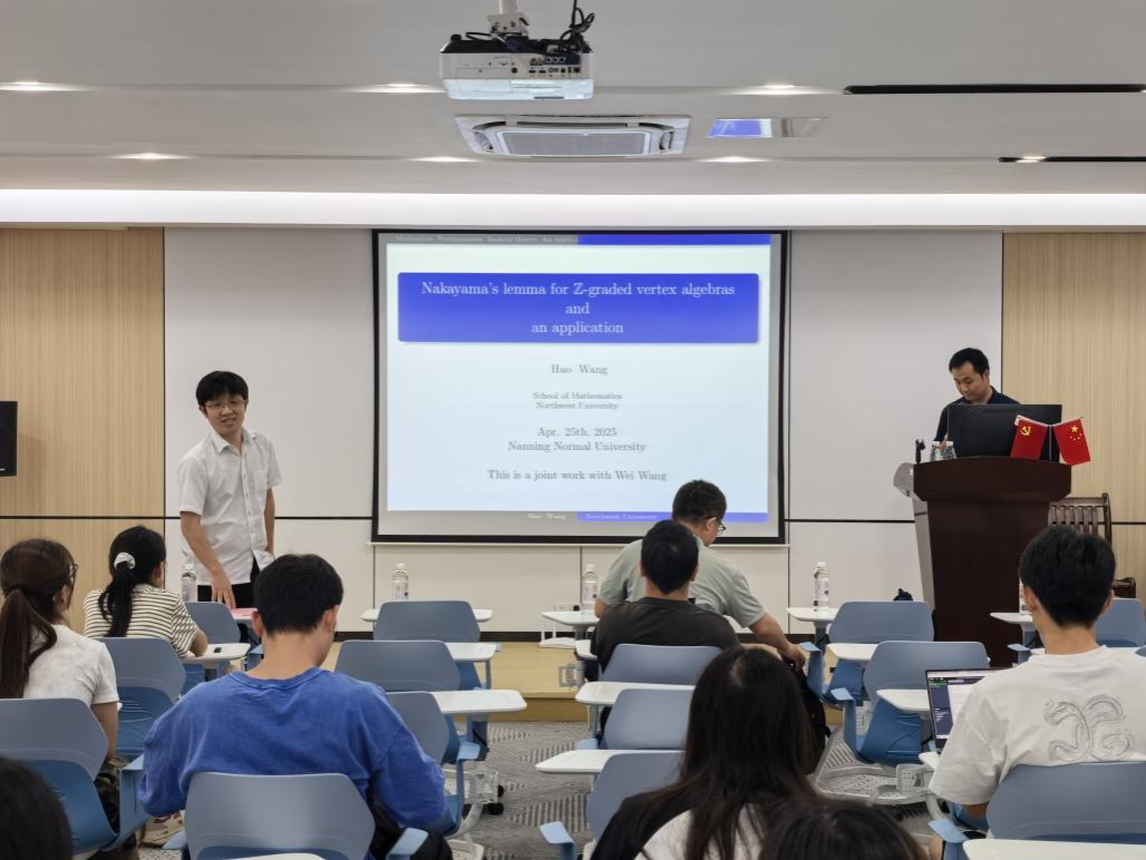 在报告中,王浩介绍了李代数的最新研究进展,系统讲解了Z-分次顶点代数的Jacobson根理论和Nakayama引理。随后,王浩引入了一类特殊的三角李代数,并由此构造了Z-分次顶点代数。