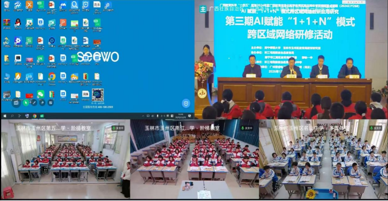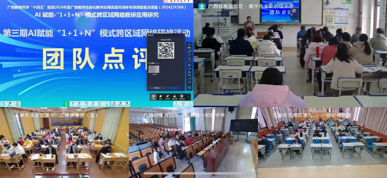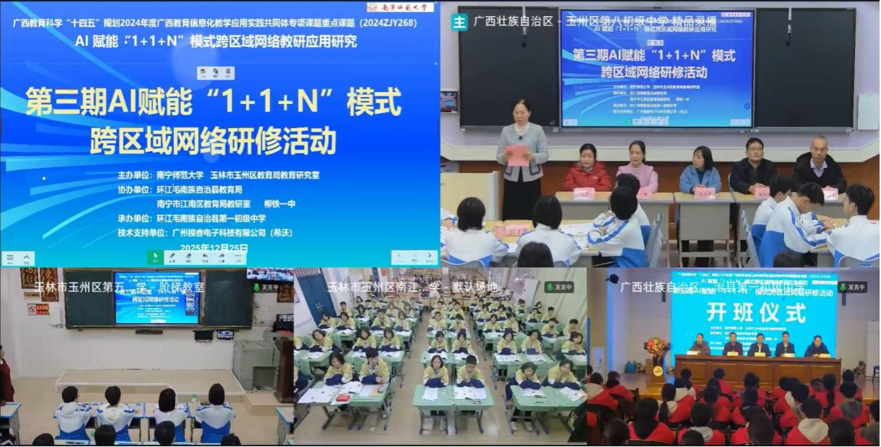 12月25日、26日,由Beat365正版唯一官网必一教育科学学院余朝文教授主持的“AI赋能‘1+1+N’模式跨区域网络教研应用研究”项目,开展第三期AI赋能“1+1+N”模式跨区域网络研修活动。本次活动由Beat365正版唯一官网必一教育科学学院主办,由实验区玉林市玉州区教育局教育研究室承办,实验区河池市环江毛南族自治县教育局、南宁市江南区教育局教研室及柳铁一中联合协办,广州视睿电子科技有限公司(希沃)提供技术支持。四县区的教育局及教研室相关领导、10所学校的领导、老师和学生出席开班仪式并全程参与活动。