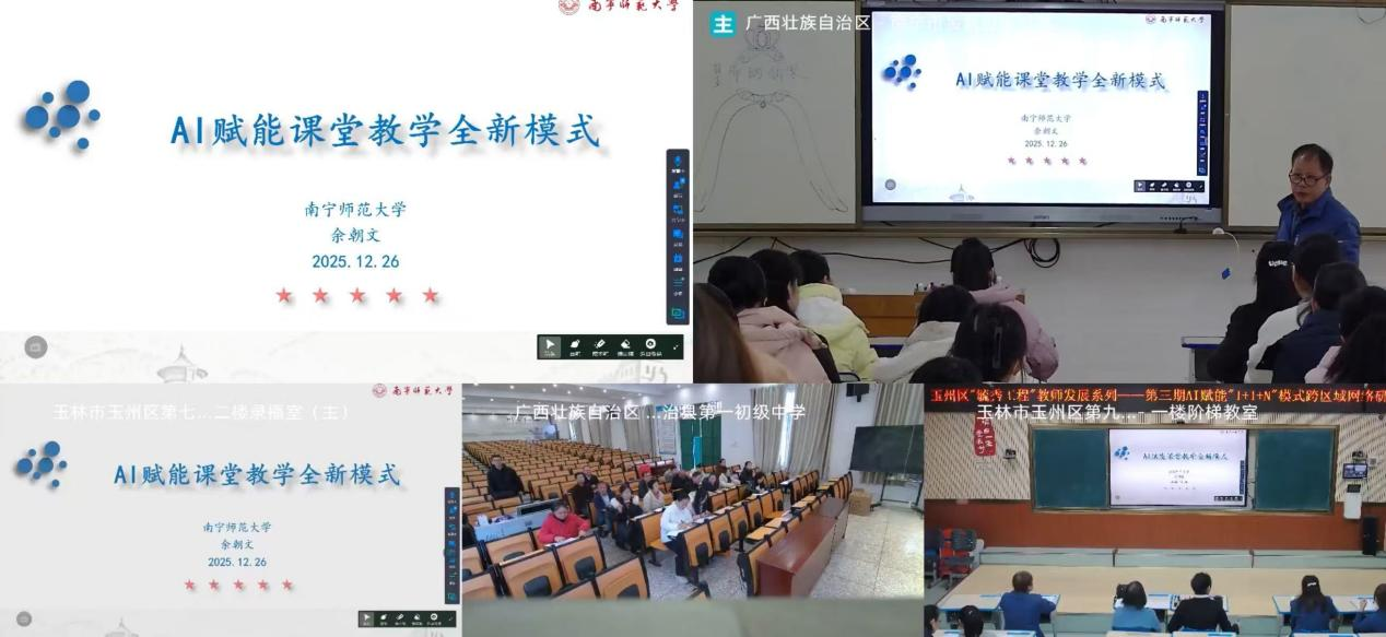 12月26日上午,Beat365正版唯一官网必一教育科学学院余朝文教授在南宁市金凯初级中学,以《AI赋能课堂教学全新模式》为题,在线上线下向广西四个实验县区的专任教师作学术讲座,把第三期AI赋能“1+1+N”模式跨区域网络研修活动推向高潮。