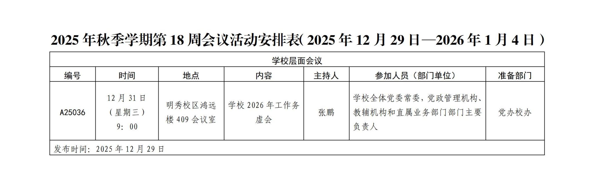 2025年秋季学期第18周会议活动安排表(2025年12月29日—2026年1月4日)