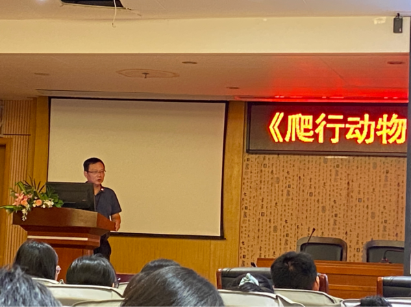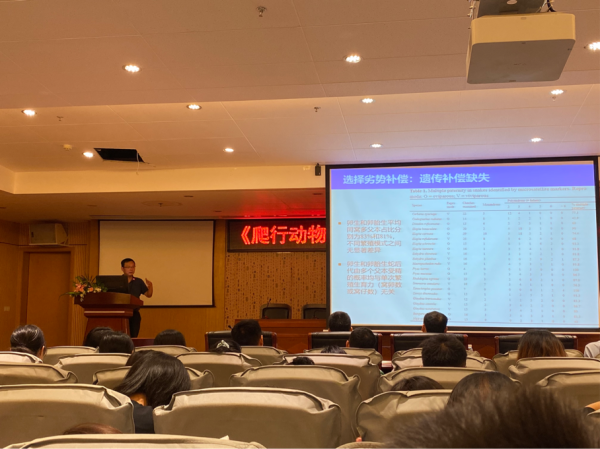 讲座开始前黄海副院长简单介绍了计翔教授个人事迹及其相关研究方向课题,并对学生提出认真听讲、做好笔记、手机静音等要求。讲座开始,计翔教授对本次学术报告进行简单介绍,然后从爬行动物的独特性讲起,继而从爬行动物卵胎生的进化和劣势补偿几方面开始讲解。他详细阐述了爬行动物卵胎生的成因及其相关假说,并对卵胎生物种选择补偿机制提出了自己的见解。整个学术报告讲解过程条理清晰、逻辑严密、内容丰富,体现了计翔教授深厚的学识功底。